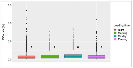 Boxplots of the dead-on-arrival (DOA) rate [%])per loading time (categories: night [23:00 to 05:00], morning [05:00 to 11:00], midday [11:00 to17:00], evening [17:00 to 23:00]); significant differences (p < 0.05) are marked with different letters (n = 14,054 broiler transports).