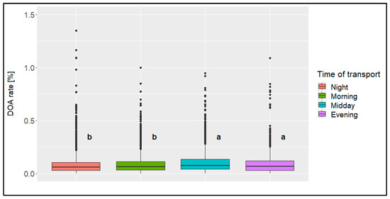 Boxplots of the dead-on-arrival (DOA) rate [%] per time of transport (categories: night [23:00 to 05:00], morning [05:00 to 11:00], midday [11:00 to 17:00], evening [17:00 to 23:00]); significant differences are marked with different letters (n = 14,054 broiler transports).