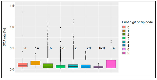 Boxplots of the dead-on-arrival (DOA) rate [%] per the first digits of zip codes, including transports from Germany only; significant differences are marked with different letters (n = 14,037 broiler transports).