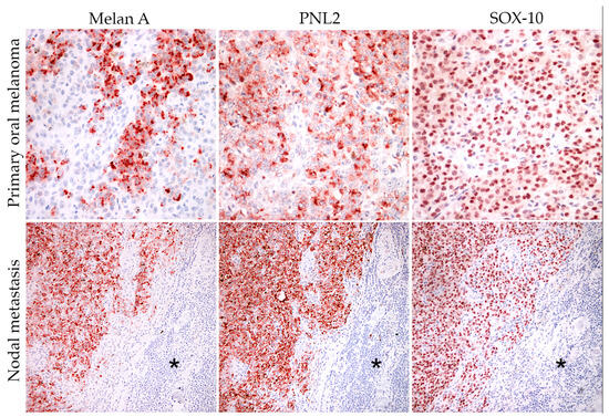 Case 3—Immunohistochemical expression of melanocytic markers (Melan-A, PNL2, and Sox-10) in both primary tumor (20×) and nodal metastasis (10×) (the asterisks represent the normal nodal tissue). The immunolabeling of Melan A and PNL2 was granular and cytoplasmic. Sox-10 was expressed in the nucleus of neoplastic cells. Carazzi’s hematoxylin was used as a counterstain.