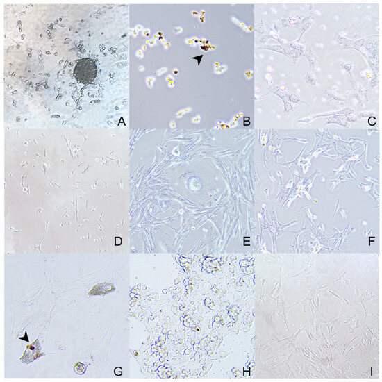 Two-dimensional cell cultures of neoplastic melanocytes obtained from primary oral neoplasia ((A) 20×—case 3; (B) 20×—case 4; (C) 40×—case 5; (D) 20×—case 6) and nodal metastasis ((E) 40×—case 1; (F) 40×—case 2; (G) 40×—case 3; (H) 40×—case 5, (I) 20×—case 6). The cells are often arranged in bundles, they are spindle-shaped with moderate cytoplasm, and well-defined cell borders that show dendritic prolongments. Within the cytoplasm of scattered cells, a dark brown finely granular pigment (melanin) is seen (arrowhead).