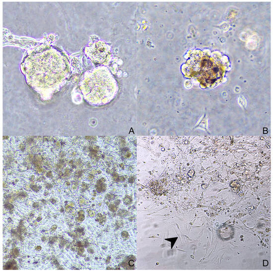 Organoids: ((A)—40×) case 1; ((B)—40×) case 4; ((C)—10×) case 2; ((D)—20×) case 3; in picture (D) neoplastic melanocytes are growing outside the Matrigel®, creating a two-dimensional culture (arrowhead).