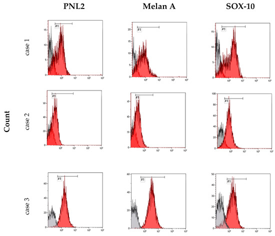 Flow cytometric analysis of cases 1, 2, and 3. The histograms show the different fluorescence intensity patterns for the tested markers: PNL2, Melan-A, and Sox-10. The red peaks represent the positive cells, while the grey peaks represent the negative ones. The sign #1 indicates the name of the gate.