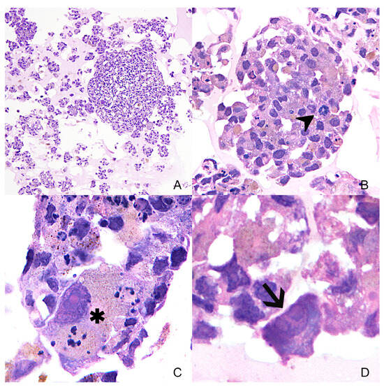 Variably size organoids ((A)—10×) of case 2 in hematoxylin and eosin. The cells show marked anisocytosis and anisokaryosis in all organoids. In Subfigure (B)—40×, mitotic figures are seen (arrowhead). In Subfigure (C)—100×, a cell with marked cytomegaly and karyomegaly is shown (asterisk). Subfigure (D)—100×, a high magnification of a cell showing multiple nucleoli (arrow).