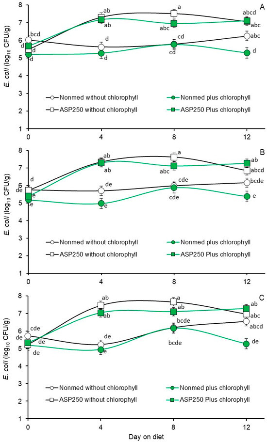 Least square means of fecal E. coli from the Phase 1 trial where pigs were fed non-medicated starter diets without supplemental chlorophyllin (open circles), non-medicated starter with diets supplemented with chlorophyllin (green circles), ASP 250-medicated starter diet without supplemental chlorophyllin (open squares) or ASP 250-medicated starter diet supplemented with chlorophyllin (green squares). Figure (A) presents E. coli populations enumerated on MacConkey agar containing no added antibiotics. Figures (B,C) present E. coli populations enumerated on MacConkey agar containing penicillin or chlortetracycline, respectively. Values are least squares means from diet by days on diet interactions based on a two-way repeated measures analysis of variance (p = 0.0015, 0.0009 and < 0.0001 for Figures (A), (B) and (C), respectively). Means within each figure associated with unlike lowercase letters differ (p < 0.05) as determined via the LSMEANS statement with Tukey–Kramer adjusted p-values and LINES option of SAS/Stat 15.1.