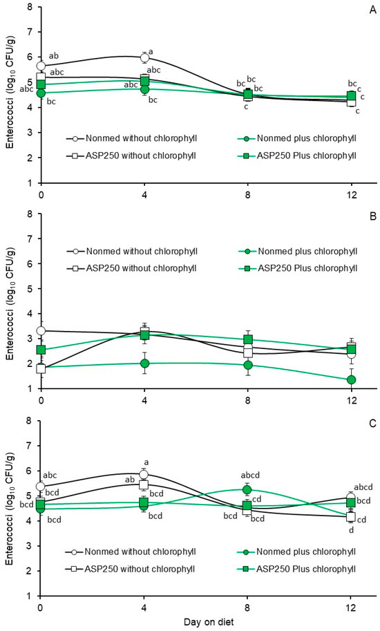 Least square means of fecal enterococci from the Phase 1 trial where pigs were fed non-medicated starter diets without supplemental chlorophyllin (open circles), non-medicated starter with diets supplemented with chlorophyllin (green circles), ASP 250-medicated starter diet without supplemental chlorophyllin (open squares) or ASP 250-medicated starter diet supplemented with chlorophyllin (green squares). Figure (A) presents enterococci populations enumerated on M Enterococcus agar containing no added antibiotics. Figures (B,C) present enterococci populations enumerated on M Enterococcus agar containing penicillin or chlortetracycline, respectively. Values are least squares means from diet by days on diet interactions based on a two-way repeated measures analysis of variance (p = 0.0511, 0.0009 and 0.1522 for Figures (A), (B) and (C), respectively). Means within each figure, when associated with unlike lowercase letters, differ (p < 0.05) or tended to differ (p > 0.05 < 0.10) as determined via the LSMEANS statement with Tukey–Kramer adjusted p-values and the LINES option of SAS/Stat 15.1.
