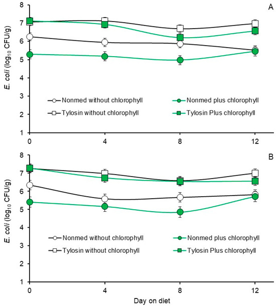 Least square means of fecal E. coli from the Phase 2 trial where pigs were fed non-medicated starter diets without supplemental chlorophyllin (open circles), non-medicated starter with diets supplemented with chlorophyllin (green circles), tylosin-medicated starter diet without supplemental chlorophyllin (open squares) or tylosin-medicated starter diet supplemented with chlorophyllin (green squares). Figure (A) presents E. coli populations enumerated on MacConkey agar containing no added antibiotics. Figure (B) presents E. coli populations enumerated on MacConkey agar containing tylosin. Values are least squares means from diet by days on diet interactions based on a two-way repeated measures analysis of variance (p = 0.2536, and 0.5530 for Figures (A) and (B), respectively). Means within each figure did not differ (p > 0.05) as determined via the LSMEANS statement with Tukey–Kramer adjusted p-values and the LINES option of SAS/Stat 15.1.