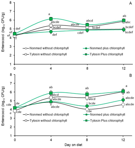Least square means of fecal enterococci from the Phase 2 trial where pigs were fed non-medicated starter diets without supplemental chlorophyllin (open circles), non-medicated starter with diets supplemented with chlorophyllin (green circles), tylosin-medicated starter diet without supplemental chlorophyllin (open squares) or tylosin-medicated starter diet supplemented with chlorophyllin (green squares). Figure (A) presents enterococci populations enumerated on M Enterococcus agar containing no added antibiotics. Figure (B) presents enterococci populations enumerated on M Enterococcus agar containing tylosin. Values are least squares means from diet by days on diet interactions based on a two-way repeated measures analysis of variance (p = 0.0003 and 0.0298 for Figures (A) and (B), respectively). Means within each figure, when associated with unlike lowercase letters, differ (p < 0.05) as determined via the LSMEANS statement with Tukey–Kramer adjusted p-values and the LINES option of SAS/Stat 15.1.