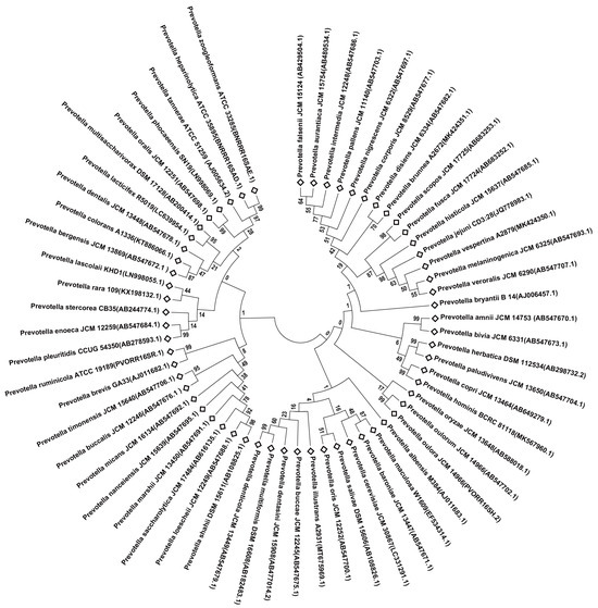 Phylogenetic tree based on 16S rRNA gene sequence of Prevotella spp., The tree was constructed with MEGA7 by the neighbor-joining (NJ) method with 1000 bootstrap replicates. Branches corresponding to partitions reproduced in less than 50% of bootstrap replicates were collapsed.