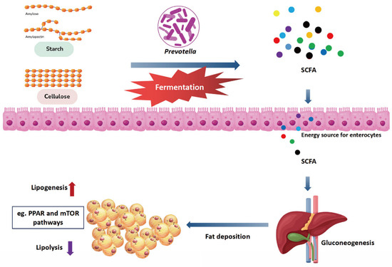 In human studies, the concentration of Prevotella or the ratio of Prevotella to Anthrobacter have been identified as key biomarkers for adiposity loss and weight management [109,110]. Similarly, studies in livestock have demonstrated that alterations in Prevotella levels influence fat deposition [111,112]. In a comparable study, Conte et al. [113] reported a positive correlation between Prevotella richness and lipid metabolism in dairy cows. In yaks, Prevotella in the rumen was positively and negatively correlated with polyunsaturated and saturated fatty acids, respectively [114]. Interestingly Prevotella intestinalis also showed significantly higher mean daily feed intake and growth performance than other intestinal types [112,115]. In terms of possible mechanisms, a previous study by our group [86] showed that donkey intestinal Prevotella load and intestinal lipid metabolism genes (e.g., PPARγ, ME1, MBOAT1, ACOX1, ACOX2, LIPH) are positively correlated or regulate host lipid metabolism through signaling pathways associated with these genes. A review of the available research reports (Figure 3) suggests that the possible mechanism is that Prevotella can efficiently derive energy from complex polysaccharides [116] through fermentation of soluble carbohydrates and degradation of insoluble plant fibers to produce short-chain fatty acids, which can be used as substrates for lipogenesis, gluconeogenesis, and cholesterol synthesis [43], which in turn can increase the fat deposition in the host. It has also been found that Prevotella can elevate the abundance of lipopolysaccharides and branched-chain amino acids in serum, which activates the mTOR signaling pathway, promotes liposynthesis, and reduces lipolysis, thus further increasing the level of fat deposition in the host [117]. Although existing studies have found that Prevotella can enhance host fat deposition, the specific regulatory pathway is still not very clear, coupled with the fact that different Prevotella strains are functionally different, and isolation and pure culture of Prevotella strains are also very difficult, so it is still difficult to explore the mechanism by which Prevotella regulates host fat metabolism in the gastrointestinal tract of livestock.