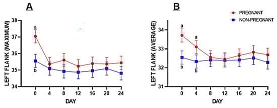 The infrared surface temperature of the left flank was significantly higher for pregnant buffaloes as compared to non-pregnant buffaloes at maximum (p = 0.013) and average (p = 0.010) values (Table 1). However, the minimum infrared surface temperature of the left flank was marginally higher (p = 0.055). The maximum surface temperature of the left flank was significantly higher on Day 0. A similar trend was observed in the average value on Day 0 and Day 4 in pregnant compared to non-pregnant buffaloes (Figure 2). The infrared surface temperature of the right flank was not statistically significant between experimental groups and on different experimental days between pregnant and non-pregnant animals (Table 1).