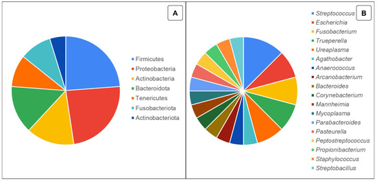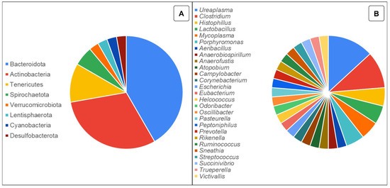 Although most published data on the vaginal microbiome have been derived from women, promising research has been conducted on cattle. A standard microbiota has not yet been defined because it is known to be influenced by several factors. However, recent studies have demonstrated that the most frequently detected bacterial phyla in the vaginas of dairy cattle are Firmicutes, Bacteroidetes, and Proteobacteria [81,96,110]. Quereda et al. [79] observed that in dairy cows, the phyla Tenericutes (35.6%), Firmicutes (25.2%), and Bacteroidetes (14.9%) represented more than 75% of the total vaginal microbiota. Other abundant phyla, such as Proteobacteria, Actinobacteria, Fusobacteria, Epsilonbacteraeota, and Patescibacteria, together with those mentioned above, represented more than 96% of the bacteria. In the present study, Ureaplasma, Histophilus, f_Corynebacteriaceae, Porphyromonas, Mycoplasma, and Ruminococcaceae UCG-005 were the most abundant genera.