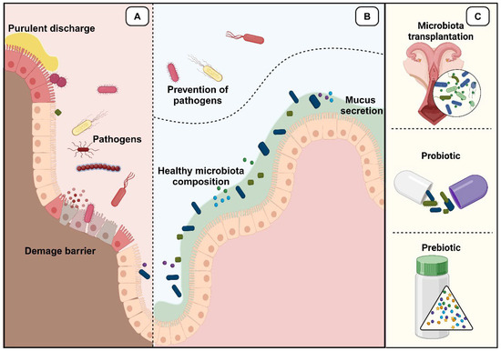 (A) Representation of the uterine/vaginal environment in the absence of healthy microbiota. (B) Uterine/vaginal environment in the presence of healthy microbiota, which prevents the development of diseases. (C) Possible tools to improve the composition of healthy uterine/vaginal microbiota.