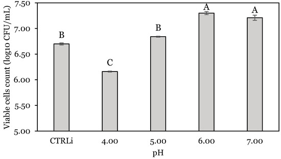 Viable cell counts of L. lactis A12 at different pH values. Different capital letters (A–C) indicate significant difference (p < 0.05). CTRLi: Initial cell count of L. lactis A12. Data are expressed as mean ± standard deviation.