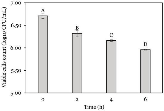 The effect of the total incubation time at pH 4.0 on the count of viable cells of L. lactis is shown in Figure 2. Negative correlation was evident since, compared to the initial count (6.71 log10 CFU/mL), the number decreased by 5.81, 8.19, and 11.17% at 2, 4, and 6 h, respectively.