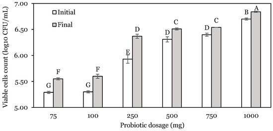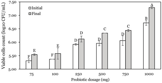 Independently of the dose used, the final cell count after the simulated stomach incubation was significantly higher (p < 0.05) than the initial (Figure 3). Bacterial counts increased by 0.26, 0.30, 0.44, 0.20, 0.14, and 0.14 log10 CFU for dosages of 75, 100, 250, 500, 750, and 1000 mg, respectively. The final viable cell count was higher for the 1000 mg dose, followed by 750, 500 mg, and 250 mg. Finally, the 75 and 100 mg probiotic doses presented the lowest final cell count for the stomach phase and did not show a significant difference (p > 0.05) between them.