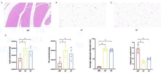 (A) Stained sections of intramuscular fat (IMF). (B) Stained sections of abdominal fat (AF). (C) Stained sections of subcutaneous fat (SF). (D) Lipid content, TG content, adipocyte diameter and adipocyte number were analyzed in three adipose tissues. Magnification of 20× was used. In the bar plot, * indicates p < 0.05.