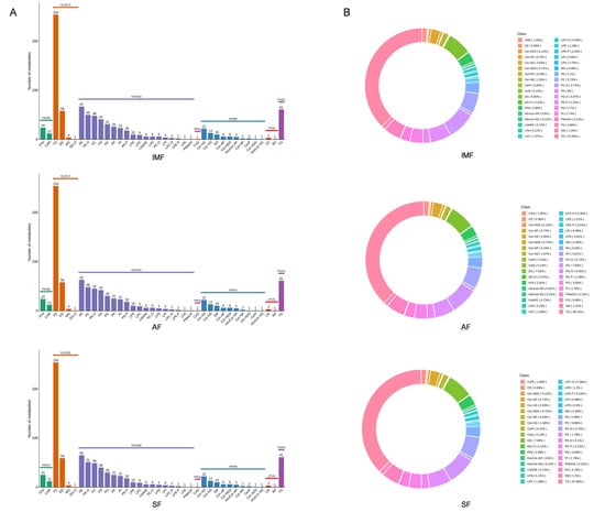 (A) Types and quantities of lipids in IMF, AF and SF of goose. (B) Comparison of lipid subclasses between different adipose tissues (nmol/g).