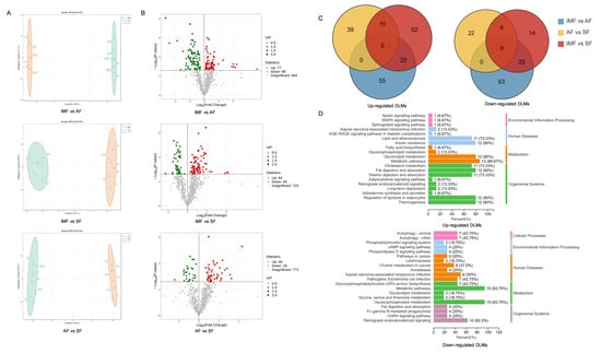 OPLS-DA was employed to ascertain the correlation between different molecular components and identify differentiating lipids. The separation patterns of individual samples for each of the three components are depicted in Figure 3A. For the comparison between IMF and AF: R2X = 0.585, R2Y = 1.000, and Q2 = 0.653. For the comparison between IMF and SF: R2X = 0.49, R2Y = 0.995, and Q2 = 0.586. For the comparison between AF and SF: R2X = 0.617, R2Y = 0.998, and Q2 = 0.583. All three Q2 values exceeded 0.5, indicating effective models and confirming the existence of differences in different adipose tissues, consistent with previous reports []. Using VIP > 1 and p < 0.05 as selection criteria, the lipid molecules were analyzed in three pairwise combinations, and differential lipid molecules (DLMs) were identified. As shown in Figure 3B comparing AF with IMF, 165 DLMs were identified, including 88 downregulated and 77 upregulated in AF compared with that in IMF. The five most significantly distinct lipid molecules included PE (O-16:1_24:4), PC (18:0_20:4), PE (O-18:1_22:2), PC (16:0_20:4), and Cer (16:1/26:0). When comparing SF with IMF, 129 DLMs were identified, with 45 downregulated and 84 upregulated in SF compared with that in IMF. The five most significantly distinct lipid molecules included TG (15:1_15:1_19:2), TG (10:0_16:0_16:1), PS (21:2_20:4), Cer (d16:0/21:0), and PC (O-16:0_20:4). When comparing SF with AF, there were 77 significantly DLMs, including 28 downregulated and 49 upregulated in SF compared with that in AF. The upregulated lipids in SF were mainly GPs. The five most significantly distinct lipid molecules based on VIP selection were Cer (d21:2/38:1(2OH)), PE (O-16:1_24:4), LNAPE (18:2/N-18:2), TG (17:0_18:0_18:1), and PI (18:0_22:4). The lipid molecules exhibiting the greatest disparity in quantity among the three adipose tissues were primarily glycerolipids and glycerophospholipids. Previous research has indicated that AF and SF are categorized as peripheral fats, with lipid molecules primarily dependent on hepatic synthesis and subsequently transported to the abdominal and subcutaneous regions through very-low-density lipoprotein (VLDL) []. Evidently, there are substantial differences in the lipid composition between IMF and AF or SF, whereas the distinctions between AF and SF are relatively minor. To explore the heterogeneity of lipid deposition in muscles compared to abdominal or subcutaneous tissue, an overlap analysis was conducted on differentially expressed lipid molecules. Among the upregulated differentially expressed lipids, 22 were found to be commonly present in both IMF vs. AF and IMF vs. SF comparisons, while among the downregulated differentially expressed lipids, 25 were shared between the IMF vs. AF and IMF vs. SF components. KEGG analysis revealed that upregulated DLMs in AF and SF are predominantly enriched in metabolic pathways and glycerolipid metabolism. On the other hand, in IMF, upregulated differential lipid molecules are mainly enriched in metabolic pathways and glycerophospholipid metabolism (Figure 3C,D).