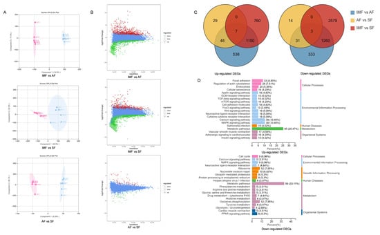 (A) Orthogonal partial least squares discriminant analysis (OPLS-DA) based on clean reads of IMF, AF and SF. (B) MA map of differentially expressed genes (DEGs) of IMF, AF and SF. (C) Venn diagram of the DEGs. (D) KEGG enrichment map of common DEGs between AF vs. IMF and SF vs. IMF.