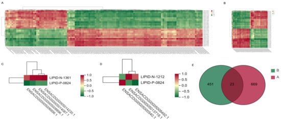 Lipids, as a result of gene expression, can further elucidate the genetic basis of differential fat metabolism in various locations through the integrated analysis of lipidomics and transcriptomics. To comprehensively investigate the correlation between the combined lipidome and transcriptome datasets in IMF vs. AF and IMF vs. SF, a correlation analysis utilizing the quantitative values of genes and metabolites across all samples was conducted to identify potential regulatory factors. The pathway with the highest enrichment of commonly DEGs and DLMs was identified as metabolic pathways. Subsequently, correlation analysis between the DEGs and DLMs within this particular pathway was performed. Within the metabolic pathways, the lipid molecule PS (20:3_20:4) exhibited a highly positive correlation with the genes PLCB1, DSE, and PDE5A. Additionally, the lipid molecule TG (10:0_16:0_16:1) demonstrated a strong negative correlation with the gene PLCB2 (|r| ≥ 0.8, p ≤ 0.05). Further analysis involved selecting the top 20 common DEGs with the highest expression levels and performing correlation analysis with the common DLMs. PG (19:2_20:4) showed a highly positive correlation with ENSACDG00005013719.1, while TG (10:0_16:0_16:1) exhibited a very strong positive correlation with FABP4. Conversely, TG (10:0_16:0_16:1) displayed a remarkably strong negative correlation with LPL (|r| ≥ 0.8, p ≤ 0.05). By selecting pairs with Pearson correlation coefficients greater than 0.60 and p < 0.05, an overlap analysis was performed, resulting in the identification of 23 pairs of DEGs and DLMs showing strong correlation. Among these, NDUF4, GPX4, and DGAT2 genes demonstrated strong correlations with TG (10:0_16:0_16:1), PS (18:0_20:4), PS (20:3_20:4), TG (16:0_16:1_18:1), and other lipid molecules (Figure 5A–E).