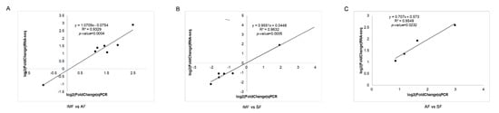 (A) Validation of differential gene in AF vs. IMF expression levels by RT-qPCR. (B) Validation of differential gene in SF vs. IMF expression levels by RT-qPCR. (C) Validation of differential gene in AF vs. SF expression levels by RT-qPCR.