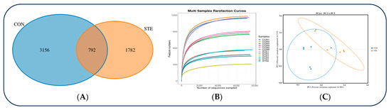A total of 960,991 original sequences were obtained by sequencing the 16S rRNA V3~V4 region of 12 samples in two groups in this experiment, of which 959,109 were valid sequences, and the sequence coverage was 99.8%. The Alpha diversity index of the samples was evaluated using QllME2 software (https://magic.novogene.com, accessed on 2 July 2024). It can be seen that a total of 5730 OTUs was obtained from samples of two groups at the 97% species similarity level, of which 792 were shared by two groups, accounting for 13.8% of the total number of OTUs. There were 3156 unique OTUs in STE and 1782 unique OTUs in CON, accounting for 55.08% and 31.10% of the total OTUs, respectively (Figure 1A).