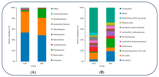 At the phylum classification level, a tally was conducted to determine the top 10 species exhibiting the highest relative abundance in the rumen microbial communities of the two groups. Among these, Firmicutes displayed the highest relative abundance in both groups, closely followed by Bacteroidota. The relative abundance of Proteobacteria in STE was significantly higher than that in CON (p < 0.05). The relative abundance of Patescibacteria and Desulfobacterota in STE was significantly lower than that in CON (p < 0.05) (Figure 2A and Table 6).