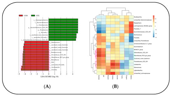 At the genus classification level, we determined the top 10 species with the greatest relative abundance in the rumen microbial communities of the CON and STE. Among these, Prevotella exhibited the highest relative abundance in both groups. Notably, the relative abundance of Prevotella_7 and Succinivibrionaceae_UCG_001 was significantly greater in the STE compared to the CON (p < 0.05). Conversely, the relative abundance of uncultured_rumen_bacterium and Rikenellaceae_RC9_gut_group was significantly lower in the STE than in the CON (p < 0.05) (Figure 2B and Table 7).