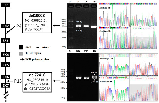 Two novel deletion polymorphisms, del19008 and del72416, were detected in the JAK2 gene using DNA pool sequencing, based on the predicted sequences from the European Variation Archive database (Accessed on 8 July 2023. http://www.ebi.ac.uk/eva/, Variant IDs: rs664724553 and rs670284366, respectively). Specifically, the del19008 locus is situated within the second intron of the JAK2 gene on chromosome 8 of the goat (NC_030815.1: g.19008_19013delTCCAT), while the del72416 locus is found in the sixth intron of the gene (NC_030815.1: g.72416_72426delCTGTACGGTA). DNA gel electrophoresis revealed only two genotypes at these loci: DD (deletion/deletion) and ID (insertion/deletion), as shown in Figure 1.