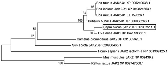 The goat JAK2 mRNA sequence was found to encode a protein consisting of 1132 amino acids. We observed that the coding sequence of goat JAK2 shares 99%, 99%, 99%, 99%, 99%, 96%, 93%, 94%, 96%, and 94% similarity with Ovis aries (XP_042099355.1, 1132 amino acids), Bos taurus (XP_005210038.1, 1132 amino acids), Bos indicus (XP_019821553.1, 1132 amino acids), Bos mutus (ELR59526.1, 1132 amino acids), Bubalus bubalis (XP_006068266.1, 1132 amino acids), Camelus dromedarius (XP_031305623.1, 1130 amino acids), Mus musculus (NP_032439.2, 1132 amino acids), Rattus rattus (XP_032747668.1, 1132 amino acids), Sus scrofa (XP_020938465.1, 1131 amino acids), and Homo sapiens (NP_001309125.1, 1132 amino acids). The phylogenetic analysis conducted using the goat JAK2 sequence revealed a close evolutionary relationship with sheep JAK2 while indicating the least similarity with the clade embodying sequences from R. rattus and M. musculus (Figure 2).