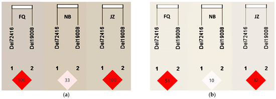 The linkage disequilibrium analysis of the loci del19008 and del72416 was conducted using Haploview 4.2 software (Accessed on 15 September 2023. http://www.broad.mit.edu/mpg/haploview/), in which D’ (0 < D’ < 1) and r2 (0 < r2 < 1) are indicators used to measure the strength of association across two linked genetic loci.