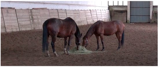 The shorter time of feeding was strongly associated with submissive behaviour, as well as sniffing, grooming, and rolling. The sniffing was observed in horses that were not so much interested in eating as in interacting with each other. The same was observed for mutual grooming, as it occurred only when the horses were not interested in feeding, and they were both affiliatively disposed. These were horses that showed an evident willingness to interact, and the fact that they ate for less time was not due to aggressive behaviour. The main reason for the shortened eating time was the preference for interacting with overeating. In this context, the usual feed, which is hay, may not have been as attractive as other tasty feed [30], and thus possibly did not clearly indicate social dominance. Instead, the hay was a good feed to observe sharing it between the horses, although sharing the hay lying on the ground provoked the most frequent agonistic behaviour in an earlier study [12]. Sharing grains was observed in Przewalski’s horses, but it was most often for sires or mares sharing it with their foals (36–77% for dams and sires, respectively) as compared to other adult horses (7%) [31]. Some horses in the current study were not interested in feeding due to separation stress. Despite not being completely socially separated, one gelding was observed to be stressed in the “incomplete” social group it usually turned out with. This confirms the previous study, when the heart rate of a separated horse decreased proportionally to the number of horses left for the company [32], confirming the ability of horses to generalise on the group “completeness”.