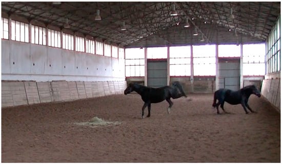 Horses, as social animals, live in groups. In natural conditions or in the wild, they form family groups (harems) consisting of several adult females (mares), a male (stallion), and their young offspring, who leave their familial group at the age of about two years [4]. Sometimes, the herd may include a subordinate adult stallion; however, males without mares usually form bachelor herds. Both in the case of harems and bachelor herds, horses create a social structure based on dominance and submission [4]. When there are many horses, harems can aggregate in large herds [5]. Such herds move together, as observed in other equids (zebras and Przewalski’s horses), while maintaining the distinction between harems and bachelor herds, as demonstrated by Ozogany et al. [6]. Therefore, horses are capable of learning and following complex social rules at the social group and supergroup level.