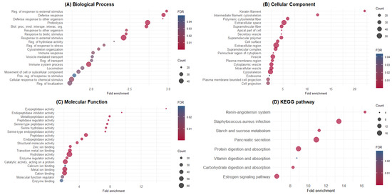 Gene Ontology and KEGG pathway enrichment analysis of ileal endogenous proteins. (A) Biological process; (B) cellular compartment; (C) molecular function; (D) KEGG pathways. The y-axis shows significantly enriched GO terms and pathways, whereas the x-axis denotes fold enrichment. The size of dots represents the number of genes within this term or pathway, and dots’ colors represent the enrichment FDR.