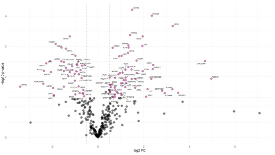 Volcano plot of differentially abundant proteins. Volcano plot representing each protein with a dot. The “x” axis represents the log2 FC between CAS and NFD and the “y” axis represents the p-value (−log10). The dashed lines indicate the significance limit in the p-value and FC. Gray dots represent proteins with non-significant changes in abundance. Colored dots represent proteins that significantly increase (right) or decrease (left) their abundance in the digesta of pigs fed CAS diets.