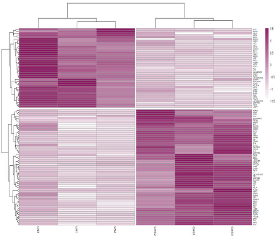 Heatmap of differentially abundant proteins (DAPs). Heatmap representing the hierarchical clustering of DAPs. Rows correspond to proteins and columns to samples. Colors represent the abundance values of proteins between NFD and CAS treatments.