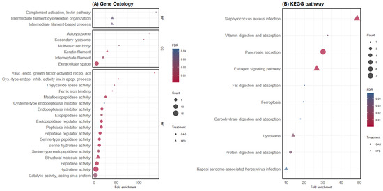 GO and KEGG pathway enrichment analysis of differentially abundant proteins. (A) GO enrichment analysis. The y-axis shows significantly enriched GO terms; BP: biological process, MF: molecular function, CC: cellular component (for each treatment (CAS and NFD)). The x-axis represents the fold enrichment, and the size of the dots represents the number of genes within each term. The colors of the dots represent the FDR enrichment. (B) KEGG pathway enrichment analysis. The x-axis displays the fold enrichment and the pathways enriched in CAS and NFD.