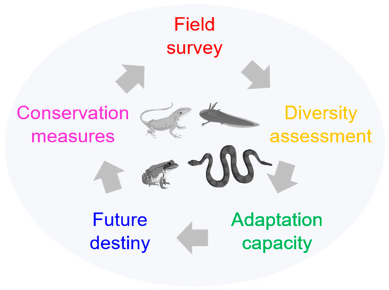 Despite the notable achievements in research on the diversity and conservation of amphibians and reptiles, many questions still require more detailed and thorough answers. With the diversification of sequencing techniques and their decreasing costs, future studies may expand genetic diversity analysis and environmental adaptation to the whole-genome level [30]. Herpetologists might consider initiating an amphibian and reptile genome project with extensive taxonomic and phylogenetic coverage, similar to the efforts made for birds, fish, and mammals. Furthermore, future studies could explore the role of commensal microbiomes in amphibian diversity, environmental adaptation, and conservation. Increasing evidence indicates that the stability and function of host-associated microbiota (e.g., cutaneous and gut microbiota) are crucial to the fitness of animal hosts [31,32,33]. This is also true for amphibians and reptiles [4,34,35]. On the one hand, the susceptibility of host-associated microbiota can mediate the impacts of environmental disturbances on animal hosts [36,37,38]. On the other hand, host-associated microbiota can also help hosts cope with environmental stress [39,40]. For example, skin microbes on frogs prevent morbidity and mortality caused by lethal skin fungi. This insight may represent a target for altering the physiological status of these animals, thereby informing conservation measures for endangered amphibians and reptiles.