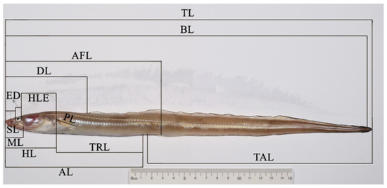 Iced fresh fishes were quickly transported to the Fishery Ecology and Biodiversity Laboratory (FEBL) of Zhejiang Ocean University of China. Then, experimenters immediately cleaned the samples in running water, drained them with absorbent paper, and placed them on a flat platform. Each individual was separately labeled with a specific code for identification, and the body weight (BW) was measured by using an electronic balance accurate to 0.01 g. The morphological analysis data comprised 5 vertebral counts and 17 morphological measurements (Table S1; Figure 2). Morphological measurements were always recorded from the left side of the fish body using a ruler and vernier caliper, with 0.1 cm and 0.01 mm precisions, respectively. Vertebral counts were carried out by removing the back muscles to expose the vertebrae. To ensure the reliability of this study, any sample that showed extensive damage or dysplasia was eliminated, meanwhile, all operations were performed by the same person.