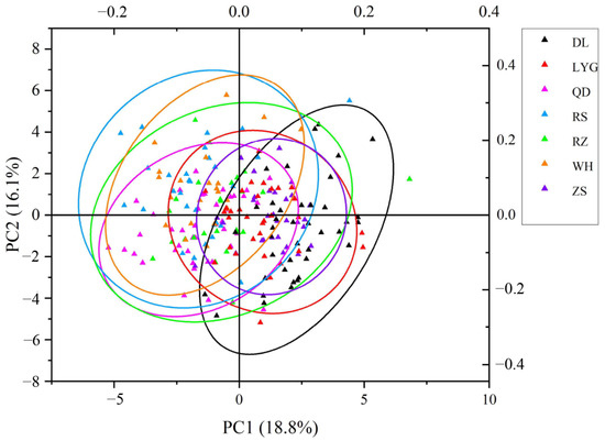 PCA scatter plot based on the first and second principal components. (DL, WH, RS, QD, RZ, LYG, and ZS stand for the Dalian population, Weihai population, Rushan population, Qingdao population, Rizhao population, Lianyungang population, and Zhoushan population, respectively).