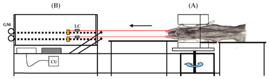 Schematic representation of the in vitro model viewed from the side: (A) = accommodation tables and holding device for the pelvis; (B) = traction unit with control unit (CU), gear motors (GMs), and load cells (LCs) to measure traction forces (adapted from Becker et al., 2010 [20]).