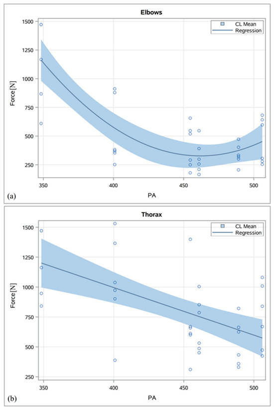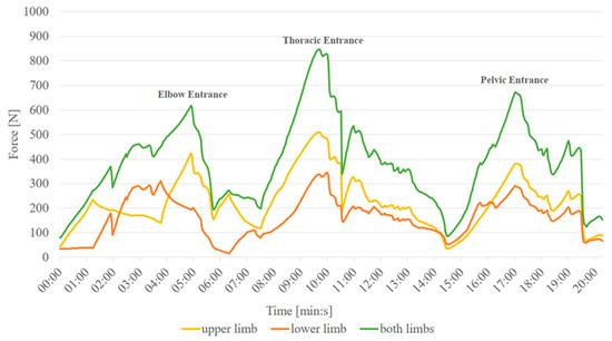Pairwise comparisons revealed a statistically significant (p < 0.05) reduction in the traction forces during the elbows’ entry between the smallest (348.4 cm2) and the second smallest (400.8 cm2) pelvis based on the PA (Figure S8). During the entry of the thorax, the reduction in the traction forces was significant between Pelvis2 and Pelvis3 (454.6 cm2; Figure S9), whereas during the entry of the calf pelvis, it was significant both between Pelvis1 and Pelvis2 as well as between Pelvis2 and Pelvis3 (Figure S10).