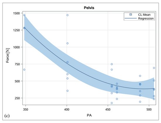 The statistical analysis was conducted using the SAS® OnDemand for Academics platform (SAS Institute, Cary, NC, USA). Univariate and multivariate polynomial logistic regression were used to analyze the relationship between pelvic and calf measurements and the maximum extraction forces per area (entrance of the shoulder, thorax, and pelvis). The strength of the association was evaluated using the adjusted coefficient of determination (r2). Paired t-tests were used to examine differences in the maximum force between two consecutive pelvises or calves. Analysis of variance components was performed using type III sum of squares. A significance level of p < 0.05 was employed.