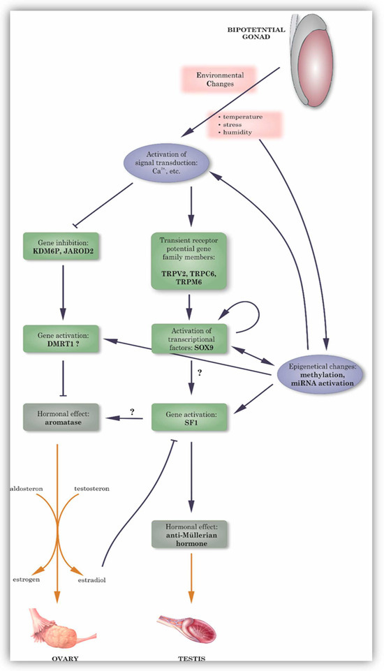 TSD is a very complex system, composed of many factors, eventually leading to the differentiation of an undifferentiated gonad into either testes or ovaries. However, in GSD, there are obvious and exclusive components that we can associate with SD, and in TSD, these remain elusive [37]. The difficulty lies in finding a factor within the embryo that is sensitive to outer temperatures and reacts differently to either high or low climatic conditions. The stimulation of such factor would then eventually lead to a male or female outcome, by either suppressing or activating a certain cascade of molecular events.