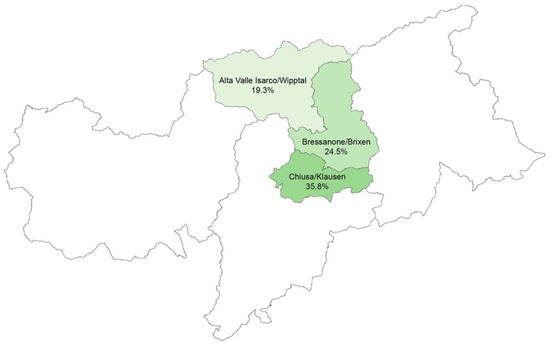This province is divided into four main local health districts, which are subdivided into 20 subdistricts. The district of Bressanone/Brixen was chosen to perform this study. This area includes three subdistricts, i.e., Alta Valle Isarco/Wipptal (with 5 municipalities), Bressanone/Brixen (with 6 municipalities), and Chiusa/Klausen (with 6 municipalities). In this province there are three official languages, i.e., German, Italian, and Ladin.