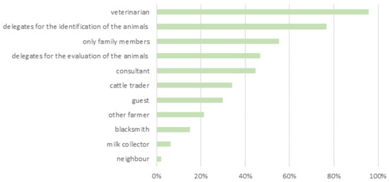 Overall, 6% of the farmers reported the presence of employees on their farm. Also, cooperation with auxiliary forces during the peak summer mowing season was reported. These people are usually recruited on a voluntary basis, not paid, and not allowed entry to the stables where animals are kept. More than 50% of the farmers stated that only family members were allowed to enter the stables where animals are kept, with some exceptions (veterinarians, authorities, etc.) (Figure 2). Stable entry is usually allowed for veterinarians (96%), followed by delegates of the local farmers’ association, people in charge of the identification of animals (77%), and the evaluation of animals (47%), respectively (Figure 2). Most of the respondents reported regularly attending animal trade or exhibition fairs (70%) and stables belonging to other farms (53%). The practice of tool and equipment sharing was adopted by 21% of the respondents. Overall, 42% of farmers attended both markets/auctions and other farms, while 13% of them followed more restrictive behavior (Figure 3).