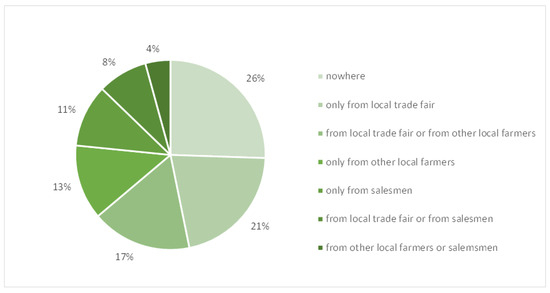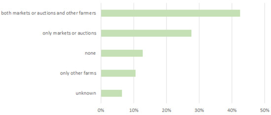 More than 60% of the farmers reported selling cattle only if necessary, and, when they sell them, they usually contact professional salesmen (89%). The majority of farmers usually purchased cattle at the local trade fair, from other local farmers or from salesmen (Figure 4). Moreover, 4% of farmers (N = 2) reported applying a quarantine period after purchasing animals. Farmers report that they do not place animals in quarantine, either because it is not possible (21%), or because it is not considered to be necessary (55%). Usually, cattle are purchased inside the province (55%), from abroad (Austria and Germany), or the neighboring Autonomous Province of Trento.