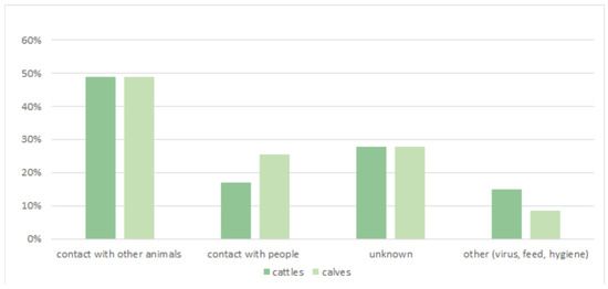 Overall, 53% of the farmers agreed that their adult cattle may be at risk of infectious diseases, while 34% of them were confident that they were not. Diarrhea in calves (89%) and mastitis in cows (43%) are considered to be the most relevant diseases. Meanwhile, 49% of the respondents were confident that contact with other animals represents the most relevant risk factor, followed by unknown variables (28%), contact with people, feed, the purchasing of cattle, viral agents, and poor hygienic conditions (Figure 5).