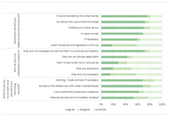 Some farmers stated that they will adopt preventive measures only if they are effective on other farms (60%), if necessary (59%), or when forced (17%). Overall, 77% of them were willing to adopt additional measures under the recommendations of a veterinarian. Moreover, 62% of them confirmed that a veterinarian had already provided information about biosecurity, and at least 51% showed interest in this topic. Farmers’ answers are displayed in Figure 6. For clarity, data are displayed on a three-point Likerts scale where the group “agree” reports the answers of farmers who strongly agree and agree with the questions, the group “disagree” reports the answers of people who are in strong disagreement and disagreement, and the group “uncertain” represents the respondents who are not sure about the answer.